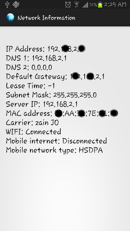 Alamat IP, DNS, Gateway, masa pajakan, Subnet Mask, pelayan IP, MAC Alamat, Carrier, WIFI, jenis Mobile, Rangkaian.