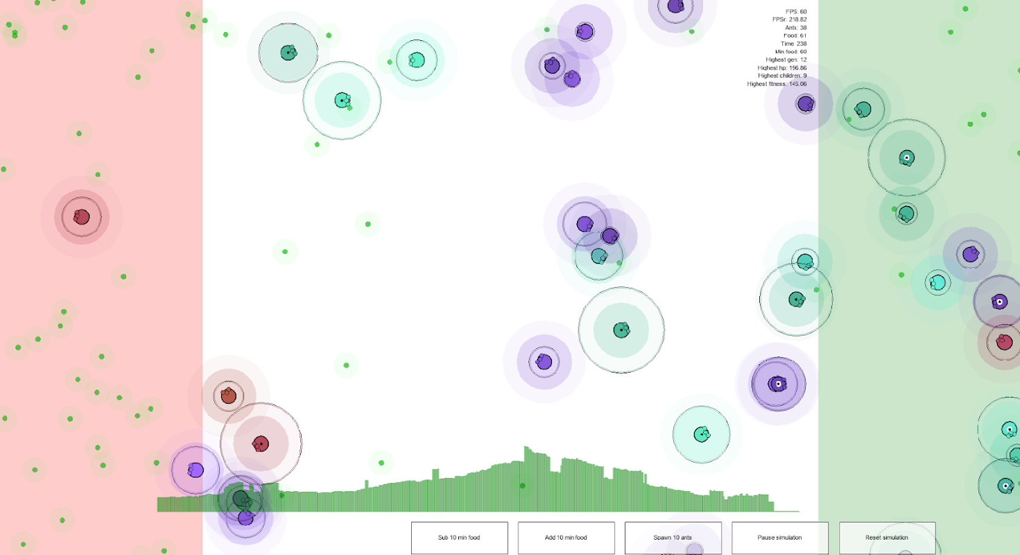 - Statistik dan grafik masa nyata (saiz populasi, makanan, kecergasan tertinggi)