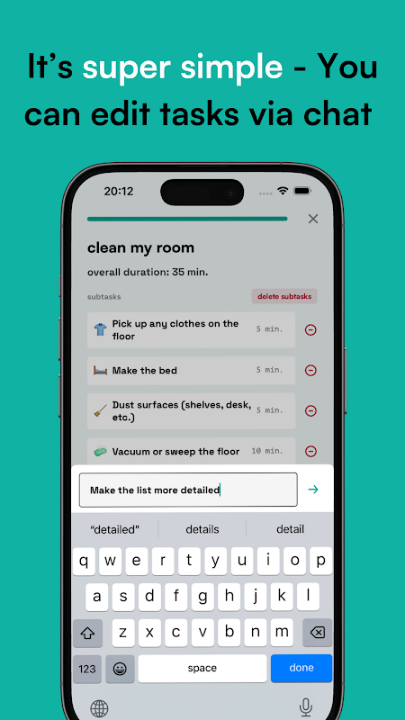 Dengan ADHD, tugas kecil pun boleh terasa besar. Pembuat senarai AI kami memahami perkara ini dan membantu anda memecahkan tugas yang besar dan menakutkan itu kepada langkah yang boleh diurus. Tiada lagi kelumpuhan tugas ADHD. Hanya tambahkan tugasan, dan AI kami menjana senarai semak—menganggarkan tempoh masa yang diperlukan dan menyusunnya ke dalam perancang anda. Satu ketikan mengubahnya menjadi senarai ringkas langkah demi langkah yang lebih mudah untuk ditangani.