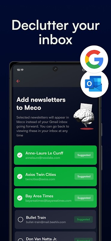 Alihkan surat berita ke Meco, pengagregat surat berita yang dibina khusus untuk membaca. Sambungkan akaun Gmail atau Outlook untuk menambah serta-merta surat berita sedia ada anda, membebaskan peti masuk utama anda daripada kekacauan. Sebagai alternatif, buat alamat e-mel @meco baharu, pastikan surat berita diasingkan sepenuhnya daripada peti masuk biasa anda.