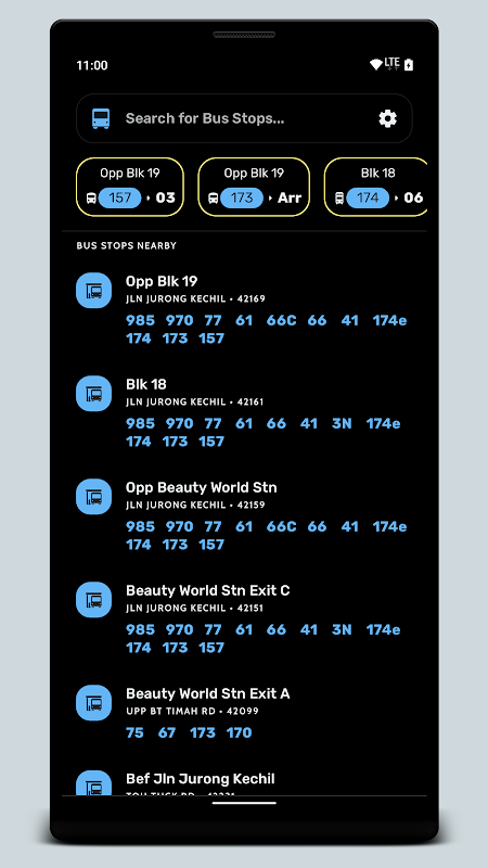 Aplikasi waktu bas yang ringkas dan indah untuk Singapura (dalam Mode Gelap)