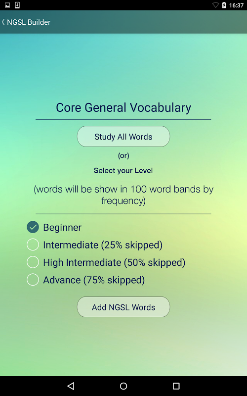 NGSL Builder menggunakan teknologi Flashcards Pintar yang direka untuk mengurangkan melupakan dengan membawa balik perkataan untuk anda untuk belajar sebelum anda lupa mereka. Aplikasi ini menyimpan rekod terperinci kemajuan anda dan keupayaan untuk e-mel kemajuan anda kepada diri sendiri atau seorang guru. Definisi ditulis dalam bahasa Inggeris yang mudah, dengan bahagian bersuara, dan sebutan setiap perkataan oleh penutur asli bahasa Inggeris.