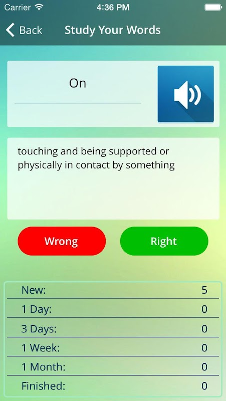 5. Jika tekaan anda adalah betul, ketik 'Right ", dan app akan bergerak ke peringkat pembelajaran seterusnya. Anda akan melihat ia dalam satu hari dari sekarang. Jika tekaan anda adalah salah, ketuk" Salah "anda akan melihat perkataan lagi tidak lama lagi.