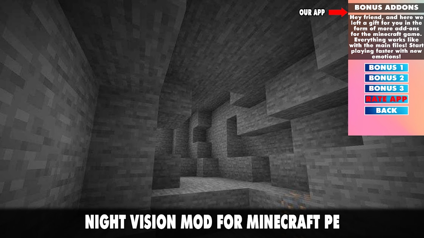 😀🤣Jika anda bosan dengan versi biasa Minecraft dan ingin mempelbagaikan permainan, anda boleh memasang salah satu pengubahsuaian kami. Inilah yang kita bincangkan di atas. Tetapi ini bukan tambahan biasa yang menambah haiwan hebat, lokasi atau alat peraga baharu, tetapi mod yang unik. Anda boleh memuat turun Mod Penglihatan Malam yang sentiasa dikemas kini untuk Edisi Poket Minecraft 2022!🤣😀