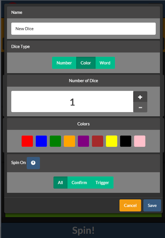 No Dice is an exciting way to spin dice. You can configure No Dice any way you want, then watch them spin like a slot machine. No Dice has numerous features that allow you to spin Numbers, Colors, or even words! No Dice also allows you to configure dice sets to trigger other dice based on results of others.No Dice has tons of features, start spinning now!.