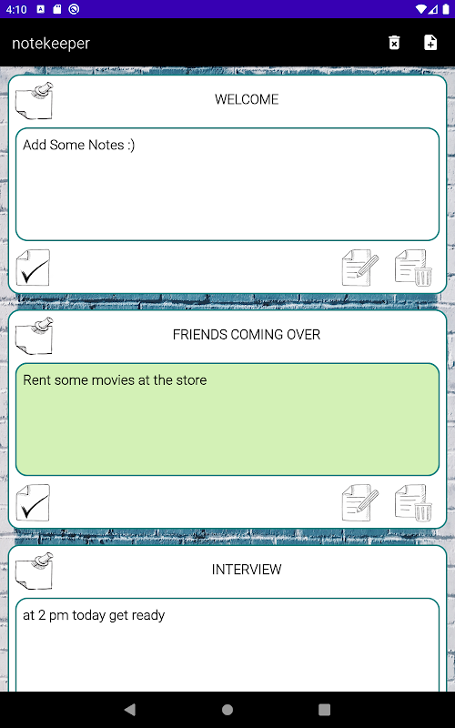 A small note keeping app that respects your free space and contains no ads written in kotlin , uses room for sql.