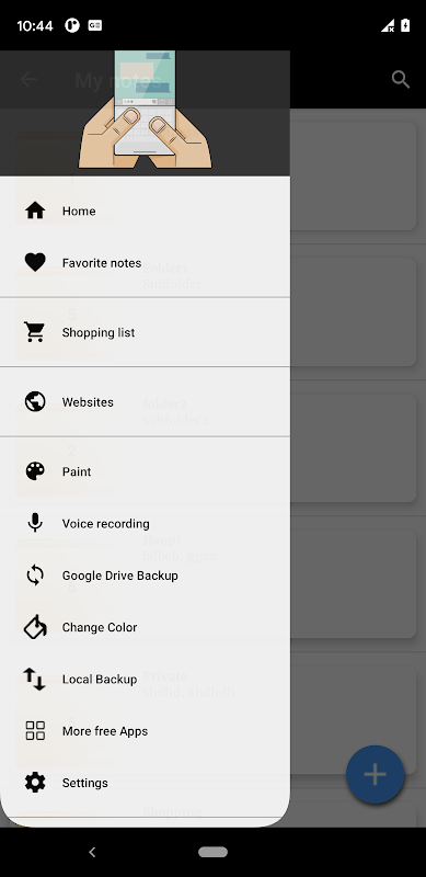 Aplikasi nota menyokong folder dan subfolder. Mula-mula anda boleh menambahkan folder utama (Kategori) dan setelah membuka folder, anda boleh mengiklankan subfolder atau menulis nota dengan foto (pilihan) dalam folder ini.