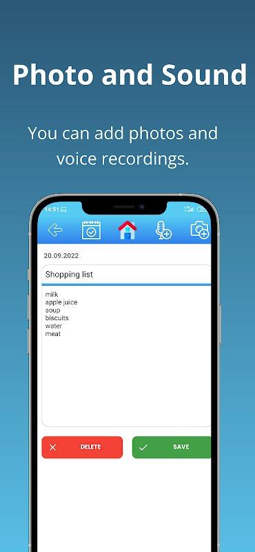 Ciri pertama aplikasi ini membolehkan andauntuk menulis sebarang maklumat yanganda perlukan. Anda boleh tambah teks,imej dan audio pada nota anda.