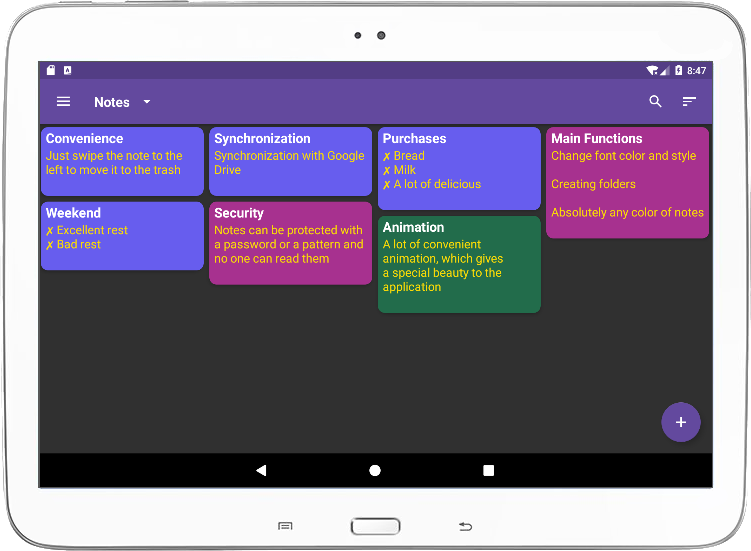 It is comfortable, beautiful and fast notepad with synchronization. Allows you to customize the colors, fonts, etc. in order to get your absolutely interface with all the amenities.