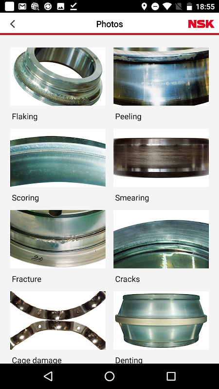 Aplikasi ini juga termasuk banyak imej dan klip bunyi untuk membantu pengguna mendiagnosis jenis kerosakan bearing dan penyebab yang mungkin. Penjelasan terperinci membantu pengguna mempelajari ciri-ciri utama pelbagai jenis kerosakan galas.