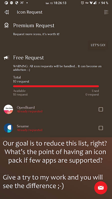 Permintaan ikon percuma dengan had (set semula selepas setiap kemas kini). Beli permintaan premium untuk meminta lebih banyak ikon dan menyokong pembangunan, terima kasih!