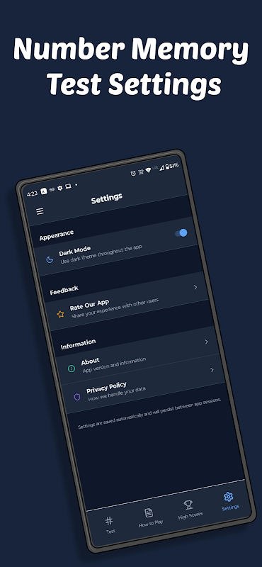 Ujian Memori Nombor ialah alat latihan otak yang direka untuk mempertajam ingatan jangka pendek dan tumpuan mental anda. Ia mencabar anda untuk mengingat dan menghasilkan semula urutan nombor yang semakin meningkat, mendorong kapasiti kognitif anda lebih jauh dengan setiap peringkat. Sama ada anda meningkatkan daya ingatan untuk belajar, ketangkasan mental atau hanya berseronok—ujian yang diilhamkan secara saintifik ini membawa peningkatan ingatan ke hujung jari anda.