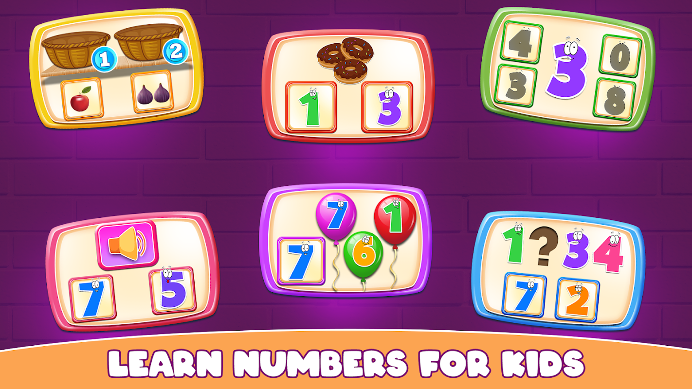 Matlamat kami adalah untuk anak-anak tidak boleh merasa sukar untuk belajar nombor. Untuk mencapai matlamat ini, enam aktiviti lucu ditambah untuk belajar nombor dengan mudah untuk kanak-kanak. Pengiktirafan nombor adalah perkara yang paling penting untuk kanak-kanak semasa mereka belajar nombor supaya mereka dapat mengenal pasti nombor dan mereka dapat belajar 123. Untuk membuat nombor pembelajaran lebih mudah untuk kanak-kanak, enam aktiviti belajar dimasukkan ke dalam aplikasi ini dan mereka adalah