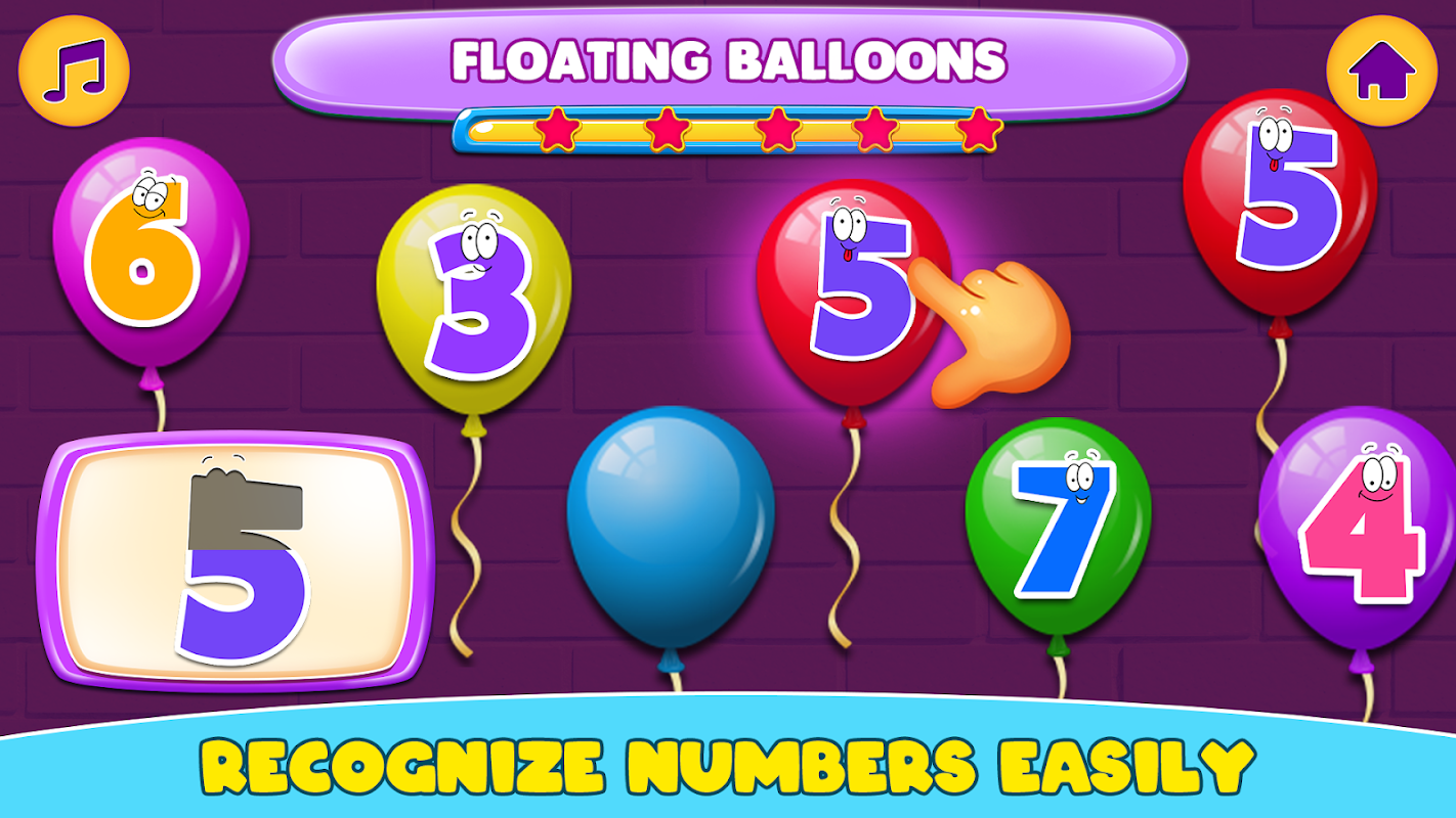 Ini cara yang sangat baik dan lucu untuk belajar 123 dengan cara yang boleh ditemui. Kanak-kanak pasti akan bersenang-senang apabila mereka bermain. Pada mulanya, nombor dengan isi kosong akan dibentangkan di sudut kiri di bahagian bawah skrin. Anak-anak mesti mengisi nombor ini dengan menyentuh nombor yang sama di dalam belon terbang.