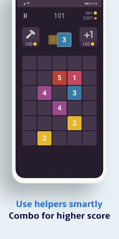 - Dengan setiap permainan, anda memperoleh lebih banyak duit syiling untuk menggunakan pembantu - menghancurkan untuk menghancurkan blok nombor atau menambah bilangan blok ketika memerlukan