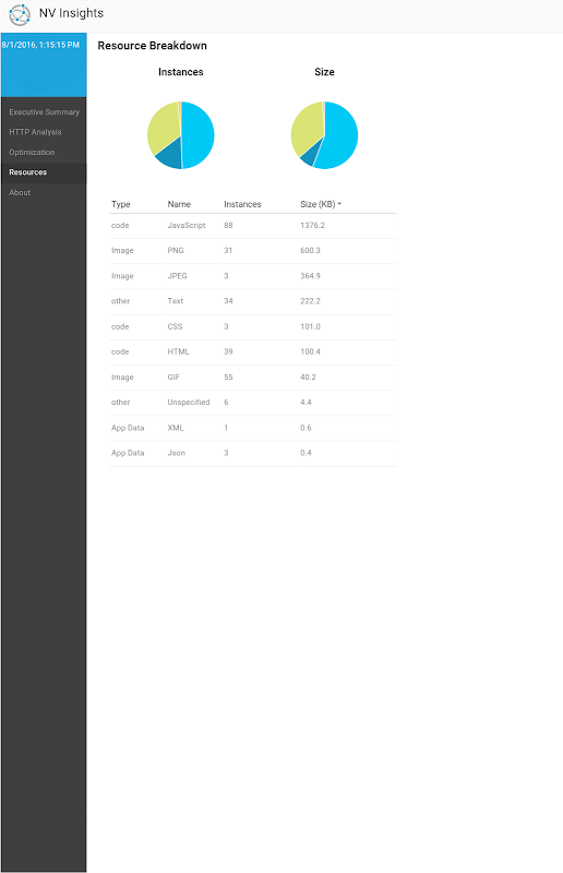 • The report includes most of HPE NV Analytics reports including HTTP/S waterfall, optimizations and resource breakdown reports.