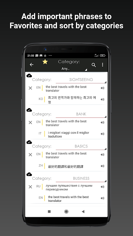 ► Kemampuan untuk mengurutkan dan memfilter frasa di Favorit berdasarkan kategori dan pasangan bahasa