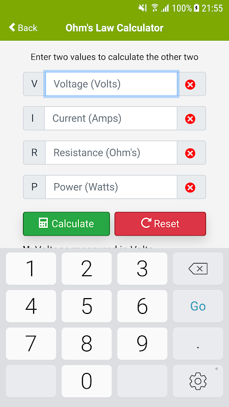 Kira atau tukar unit elektrik Voltan (volt), Arus (Amp), Rintangan (Ohm) atau Kuasa (Watts) dalam apl yang mudah digunakan untuk digunakan.