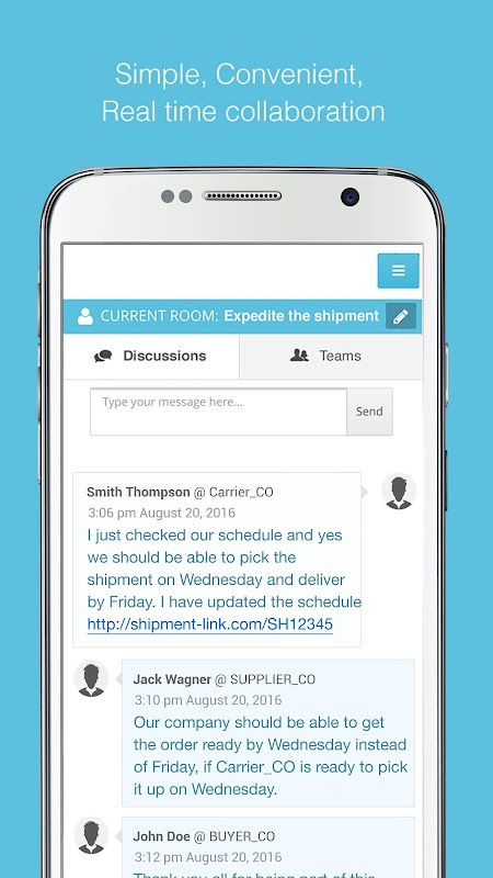 ONE Chat ™ adalah aplikasi chat untuk perniagaan. Bekerjasama dengan selamat dengan kenalan di dalam dan di luar syarikat anda. Satu Chat bersepadu sepenuhnya dengan One Real Time Network Rantaian Nilai Network. Pengguna perniagaan sudah di Real Time Network Rantaian Nilai boleh bekerjasama serta-merta dengan rakan dagangan dalam persekitaran pelbagai pihak yang selamat untuk menyelesaikan masalah rantaian bekalan.