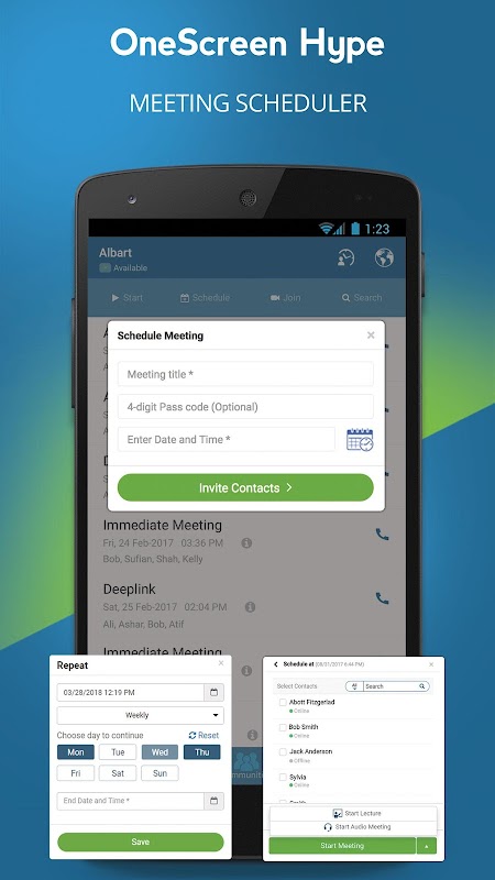 Selepas memasang, anda boleh dengan segera menganjurkan mesyuarat dengan mana-mana peranti termasuk skrin mudah alih, desktop, komputer riba, tablet dan bilik persidangan. Tetamu anda tidak memerlukan akaun OneScreen Hype, mereka boleh menyertai menggunakan mana-mana pelayar, Skype untuk Perniagaan, H.323, SIP, dial-in atau aplikasi OneScreen Hype.
