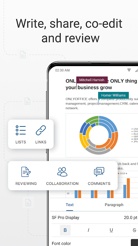 ONLYOFFICE Documents ialah aplikasi percuma untuk bekerja dengan dokumen pejabat. Akses dan urus fail yang disimpan dalam awan ONLYOFFICE dengan mudah. Bekerjasama pada dokumen bersama-sama dengan rakan sepasukan anda. Lihat, urus dan edit fail tempatan.