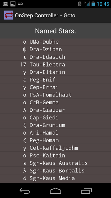 OnStep is a DIY computerized GoTo controller for Telescope mounts. This App controls most functions through Bluetooth from your Android cell phone or tablet. The user can align the mount, park/un-park, program PEC, and find and go to objects from several catalogs. Including: NGC, Hersclel 400, and Messier catalogs along with an catalog of bright stars.