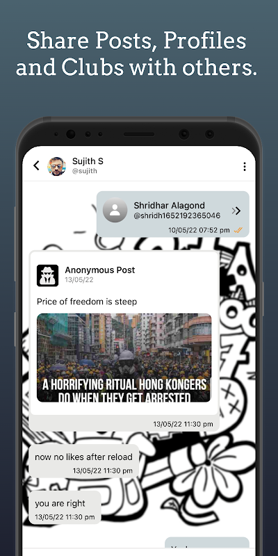 Share posts, profiles, and clubs, with your friends, privately with the in-app chat feature.