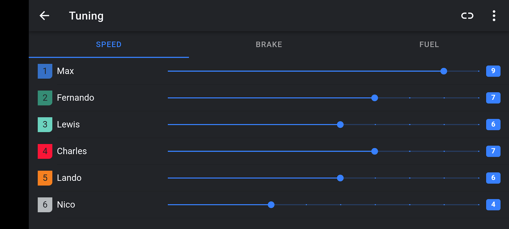 - laraskan kelajuan kenderaan, daya brek dan saiz tangki bahan api untuk setiap kereta secara individu.