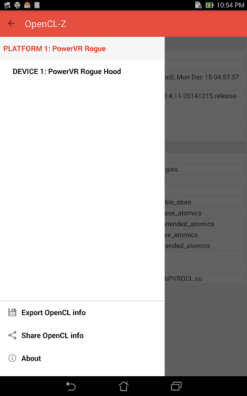 Permohonan ini menyediakan cara yang mudah untuk pemaju untuk memeriksa ketersediaan OpenCL pada peranti. Platform terperinci dan maklumat peranti disediakan. Selain itu, aplikasi ini mampu memberikan prestasi pengkomputeran mentah termasuk ALU (Unit Aritmetik Logik) prestasi dan ingatan prestasi jalur lebar. Ini boleh membantu pemaju cepat memahami kemampuan peranti OpenCL-mampu yang tertentu, dan mungkin berguna untuk ramalan prestasi dan algoritma pengoptimuman.