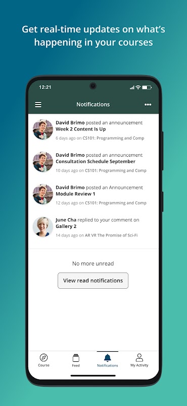 Melengkapkan modul pada kelajuan anda sendiri, bila-bila masa, di mana sahaja. Belajar bersama-sama oleh aktiviti menyertai, kerja projek secara berkumpulan, berkongsi idea dan berbincang dengan pelajar lain.