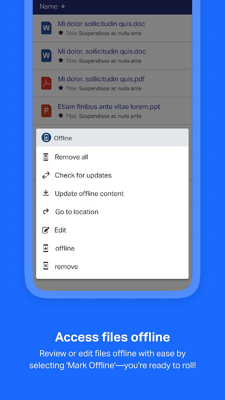 Documentum Mobile menyediakan akses mudah alih yang selamat untuk pelanggan OpenText Documentum untuk melihat dan berinteraksi dengan kandungan mereka. Ia adalah aplikasi mudah alih ringan yang memaut terus ke repositori Documentum yang membolehkan pengguna menyemak imbas, mencipta/memuat naik, mengakses, mengedit dan menambah versi fail, mencari, melihat & mengedit sifat, memproses tugas, memulakan aliran kerja, mengimbas kod bar/kod QR, mengurus kitaran hayat. , perhubungan dan kerja di luar talian. Documentum Mobile adalah percuma untuk pelanggan baharu dan sedia ada dengan Documentum versi 16.7 ke atas.