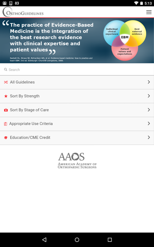OrthoGuidelines adalah rumah bagi produk yang berkualiti AAOS, seperti garis panduan amalan klinikal dan kriteria penggunaan yang sesuai. Para pengguna boleh melayari semua cadangan garis panduan oleh penyakit ortopedik, khusus, kata kunci, kekuatan bukti, dan / atau peringkat penjagaan. Platform ini telah dibentangkan dengan ringkas garis panduan dan cadangan topik untuk pembantu dalam navigasi pantas, kefahaman dan penggunaan klinikal. Pengguna juga boleh mencari semua AAOS cadangan, rasional dan kriteria penggunaan yang sesuai dengan carian kata kunci. Aplikasi ini menyediakan cadangan berasaskan bukti di tempat penjagaan untuk membantu doktor dengan klinikal membuat keputusan dan perbincangan doktor-pesakit.