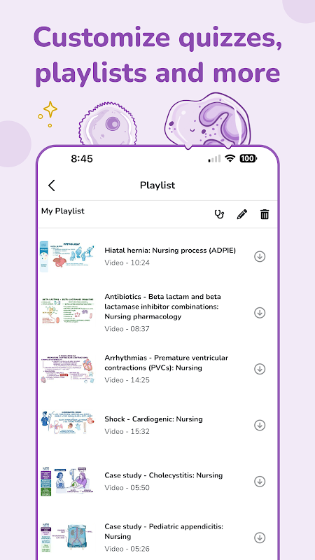 - Dapatkan lebih banyak bahan dengan lebih cepat. Sebuah perpustakaan yang berkembang dengan 475+ video kejururawatan yang dibangunkan oleh pendidik kejururawatan untuk jururawat hari ini, serta ratusan video sains, yang memendekkan kuliah selama 1 jam menjadi hanya 10 minit. Tersedia untuk dimuat turun untuk kegunaan luar talian!