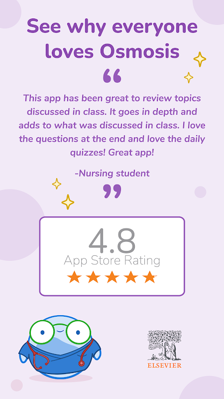 Osmosis daripada Elsevier ialah platform pembelajaran yang berkuasa yang membantu pelajar kejururawatan dan pengamal jururawat belajar dengan lebih bijak dan mengekalkan lebih banyak maklumat dalam cara visual. Aplikasi ini menawarkan video, soalan, jadual perubatan dan sumber lain mengenai pelbagai topik kejururawatan dan kesihatan, daripada proses kejururawatan, penjagaan kejururawatan klinikal, farmakologi kejururawatan, fisiologi, patologi dan amalan klinikal.