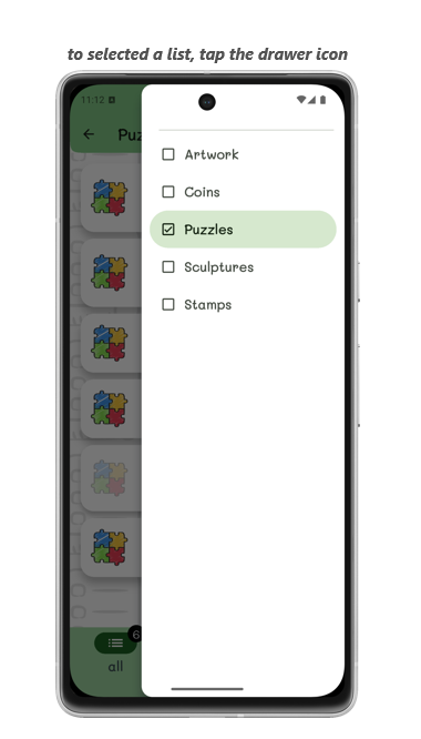 Untuk memilih senarai, ketik ikon laci dalam bar aplikasi dan ketik senarai yang diperlukan.