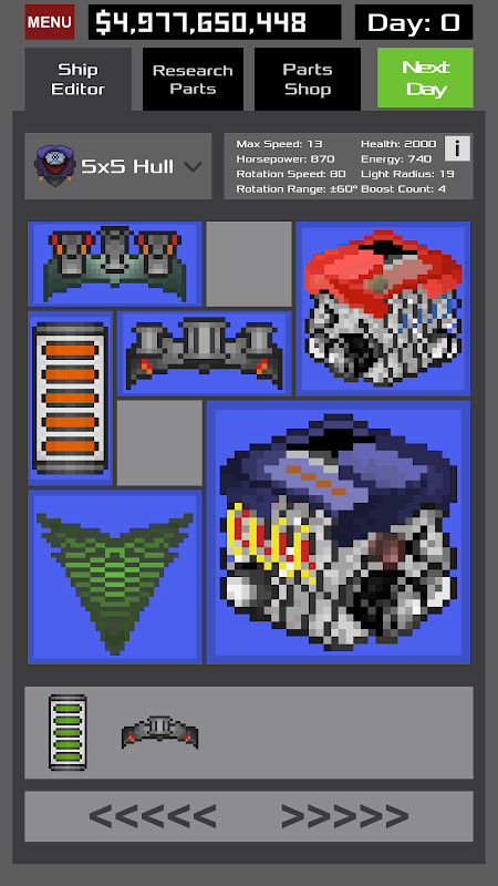 Buka kunci kapal yang lebih baik yang boleh memuatkan lebih banyak enjin, penggalak dan bateri. Buka kunci 6 kapal, 25 bahagian dan 243 peningkatan.