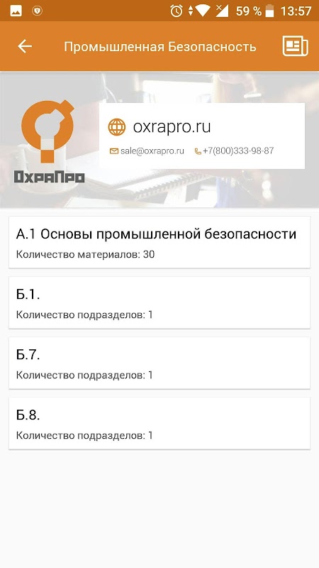 Dalam aplikasi OxraPro, anda akan menemui kursus terstruktur dan berguna mengenai perlindungan buruh, keselamatan kebakaran, ekologi, keselamatan elektrik, pertahanan awam dan situasi kecemasan, bantuan perubatan, loji tenaga termal, keselamatan industri