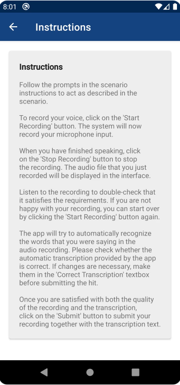 How it all works: You will be given a scenario and instructions to record aloud. The recording will be sent to an AI, which will provide the transcription (i.e. the text) of the sample you recorded, and you will be asked to provide any necessary corrections.