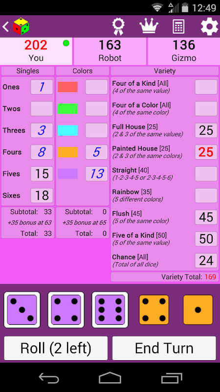 Matlamatnya adalah untuk menjaringkan mata dengan menggulung dadu untuk membuat kombinasi tertentu. Semasa setiap pusingan, anda dibenarkan untuk melancarkan dadu sehingga 3 kali dan boleh memilih mana yang akan dipegang sebelum menggulingkan yang lain. Selepas 3 gulung (atau kurang jika anda memutuskan untuk berhenti), anda mesti memilih kategori pada kad skor anda untuk menetapkan mata. Setiap kategori hanya boleh digunakan sekali sahaja. Pemain bergilir melakukan ini sehingga semua kategori skor digunakan, maka sesiapa yang mempunyai skor tertinggi menang. Arahan lebih terperinci dimasukkan ke dalam aplikasi.