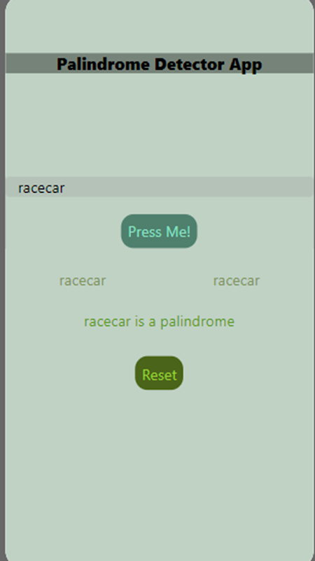 Just type your text in the input and press the button - 'Press Me!'. You will get to know if your text is a palindrome or not.