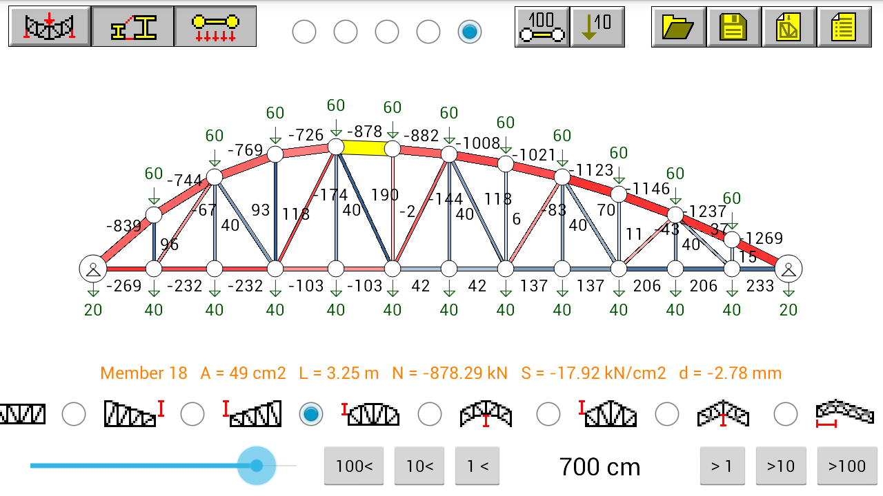 Apabila pengguna menukar nilai apa-apa parameter kekuda dikemaskini dan sistem secara automatik mengira semula dan dinamik membentangkan keputusan. Ini membolehkan pengoptimuman reka bentuk struktur, menentukan nilai-nilai yang menghasilkan kuasa minimum, tekanan, pesongan dan berat sendiri struktur.