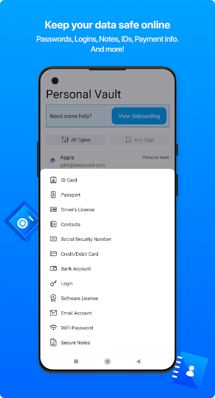 Passwarden bukan sahaja pengurus kata laluan yang selamat, ia adalah tempat yang selamat untuk semua data penting anda seperti kad ID, maklumat pasport, lesen memandu, SSN, kenalan, data perbankan, akaun, dll.