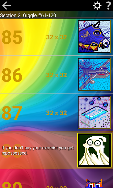 Selesaikan penyelesaian untuk melihat gambar kecil yang telah anda buat. Sebagai ganjaran tambahan anda mendapat lelucon bodoh atau petikan yang berkaitan dalam beberapa cara ke gambar. Grin atau tertawa, ketawa atau mengerang, ia akan memberi anda sedikit perkara untuk difikirkan semasa anda pergi ke teka-teki seterusnya.