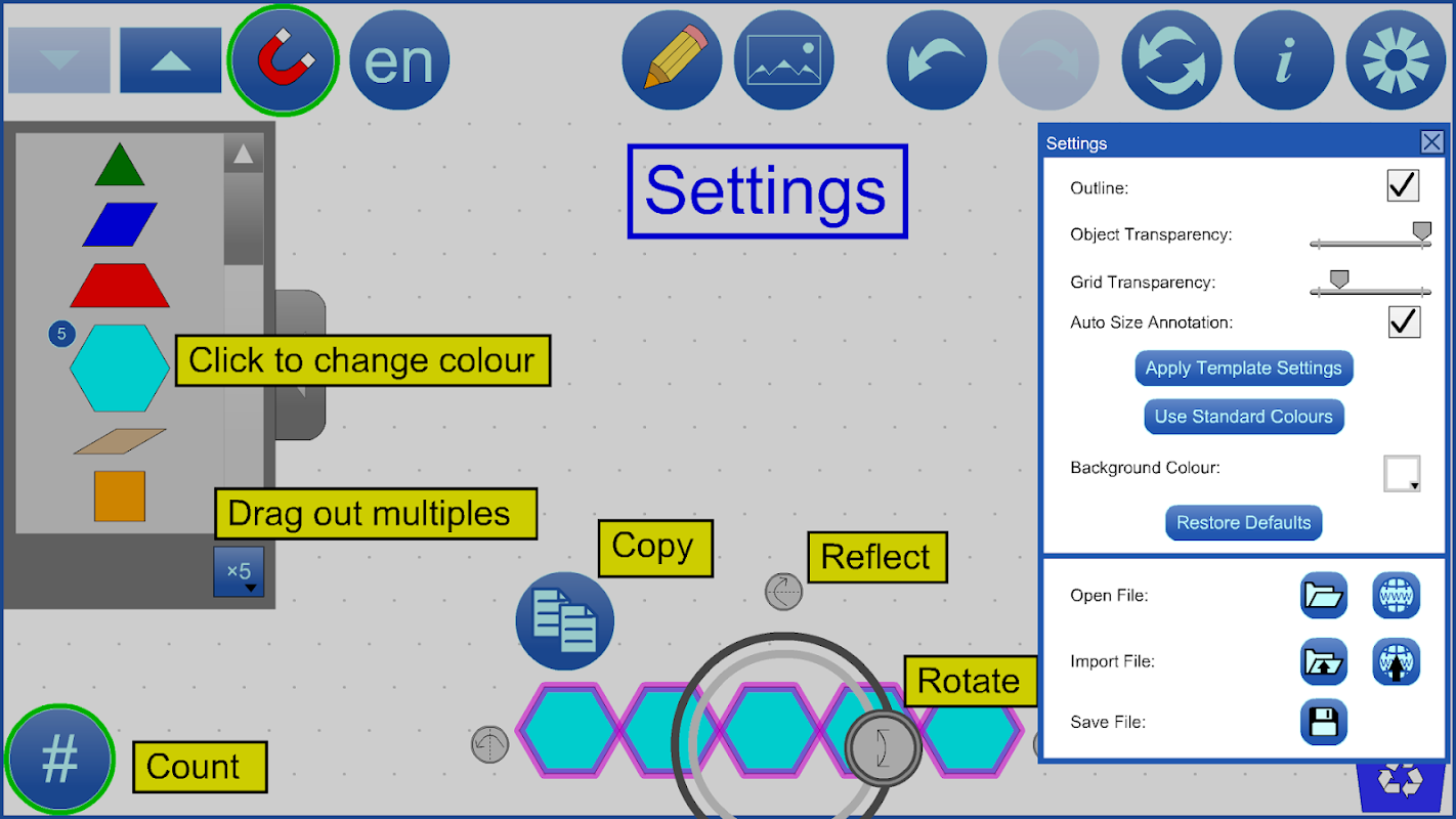 * Blok snap satu sama lain kecuali mengejar dimatikan menggunakan butang magnet