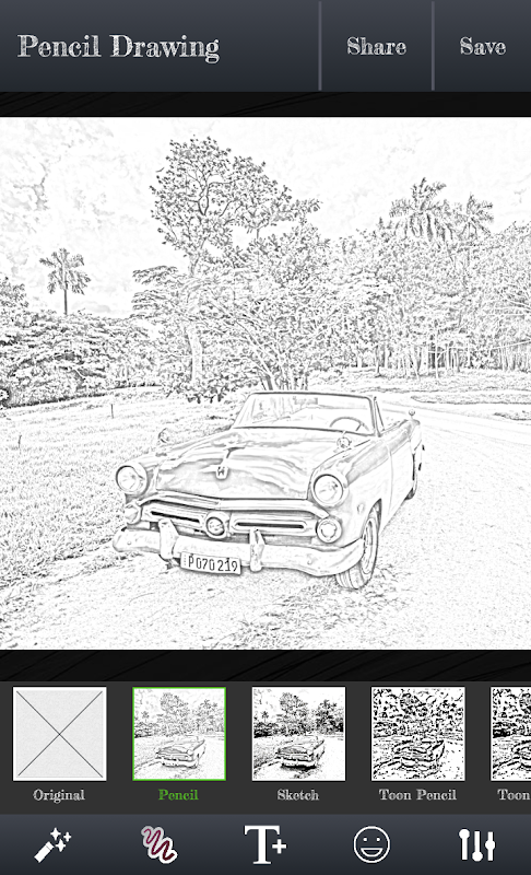 After editing the image, the last step is saving or sharing it. It can be done by a single click. Locate the save or share buttons in the action bar and tap them. Saving it will create a special folder for "Pencil Drawing" edited images. If you decide to share it, available options include: Facebook, Whatsapp, Instagram, Email, MMS and many more.