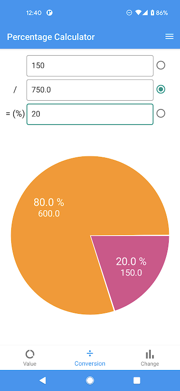 Dengan Kalkulator Peratusan anda dapat mengira dan memvisualisasikan hampir semua jenis peratusan secara serta-merta. Mana-mana nilai input boleh menjadi sumber atau keputusan pengiraan - hanya masukkan nilai yang anda tahu dan pilih apa yang anda mahu hitung dan ia akan mengira baki yang lain.