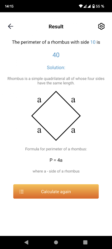 Perimeter kalkulator membolehkan anda mencari perimeter bentuk geometri yang berbeza, seperti bulatan, persegi, segi empat tepat, segi tiga, segi empat selari, rombus, trapezoid dengan formula yang berbeza.
