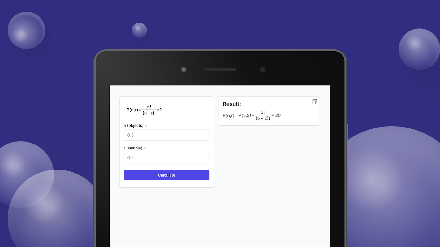 Buka misteri kombinatorik, dan perdalam pemahaman Anda tentang permutasi dengan 'Kalkulator Permutasi nPr'. Ideal untuk upaya akademis, memecahkan teka-teki, atau sekadar memuaskan keingintahuan matematika. Selami dunia keteraturan dan pengaturan yang menakjubkan, semuanya ada di ujung jari Anda.