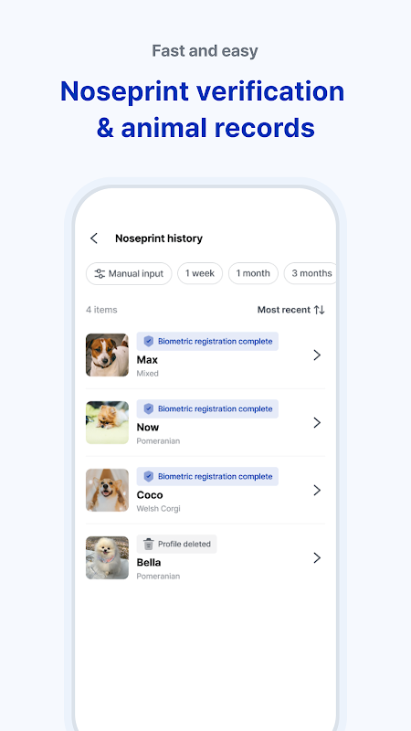 Daftarkan identiti haiwan peliharaan anda dengan mudah menggunakan hidung anjing anda dan alami sistem pengurusan yang sistematik.