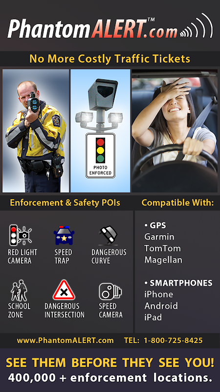 Cukup muat turun lebih dari 400,000 lokasi penguatkuasaan dan keselamatan dan ubah peranti anda menjadi pengesan radar maya. Anda akan menerima amaran Suara dan Visual yang memberi anda banyak masa untuk melambatkan dan mengetahui keadaan sekeliling anda. Perangkap kelajuan, kamera lampu merah, kamera laju, pusat pemeriksaan DUI, anda akan melihatnya sebelum mereka melihat anda. Sekiranya anda benci tiket lalu lintas, maka ini adalah perkhidmatan untuk anda. Kali pertama ia berfungsi, ia telah membayar sendiri. Dengan PhantomALERT pada GPS atau SmartPhone anda, anda boleh memandu di mana sahaja di AS atau Kanada tiket dan kemalangan.
